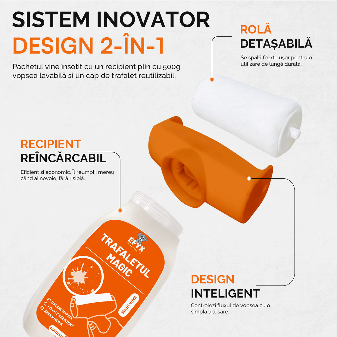 Este foarte simplu – se desface capacul rezervorului, se umple sticla inclusă cu vopsea, iar trafaletul este gata de utilizare imediat.
